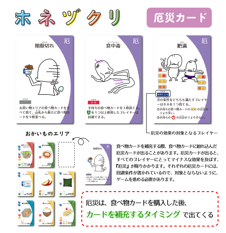 食べ物カードを補充する際、食べ物カードに紛れ込んだ厄災カードが出ることがあります。厄災カードが出ると、すべてのプレイヤーにとってマイナスな効果を及ぼす『厄災』が降りかかります。例えば『食中毒』という厄災カードが出た場合、全プレイヤーは手持ちの食べ物カードを3枚捨てなくてはなりません。ただし、それぞれの厄災カードには回避条件が書かれており、『食中毒』の場合は『免疫』の入った食べ物カード持っていれば、回避することができます。この厄災が入っていることで、常に免疫の含む食べ物カードを所持しつつプレイする必要が出てきます。