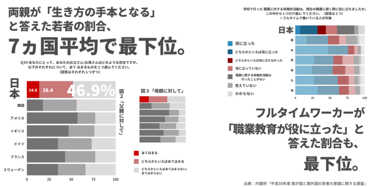 また、日本のフルタイムワーカーが「職業教育が進路選択に役に立った」と答えた割合は、先進七カ国中最下位から二番目です。つまり家庭と学校は、子供に充分な職業選択の知識を付与できていないということです。