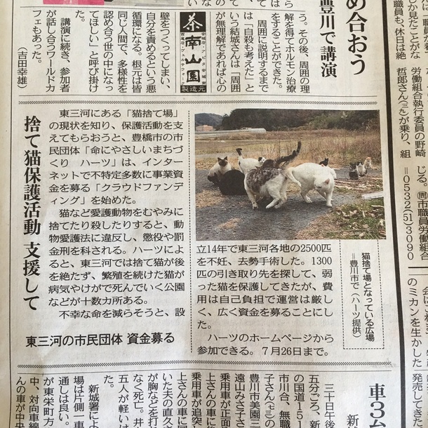 開始から5日目となりました。 すでに目標金額の60%以上を達成しており、皆様からの暖かいご支援、メッセージに感謝の気持ちでいっぱいです! 本当にありがとうございます! 昨日5/31の中日新聞朝刊に、ハーツのクラウドファンディングについて 書かれた記事が掲載されました。 インターネットを使わない方々にも、新聞を通して、捨て猫たちの現状を知って頂けたら良いなと思います。