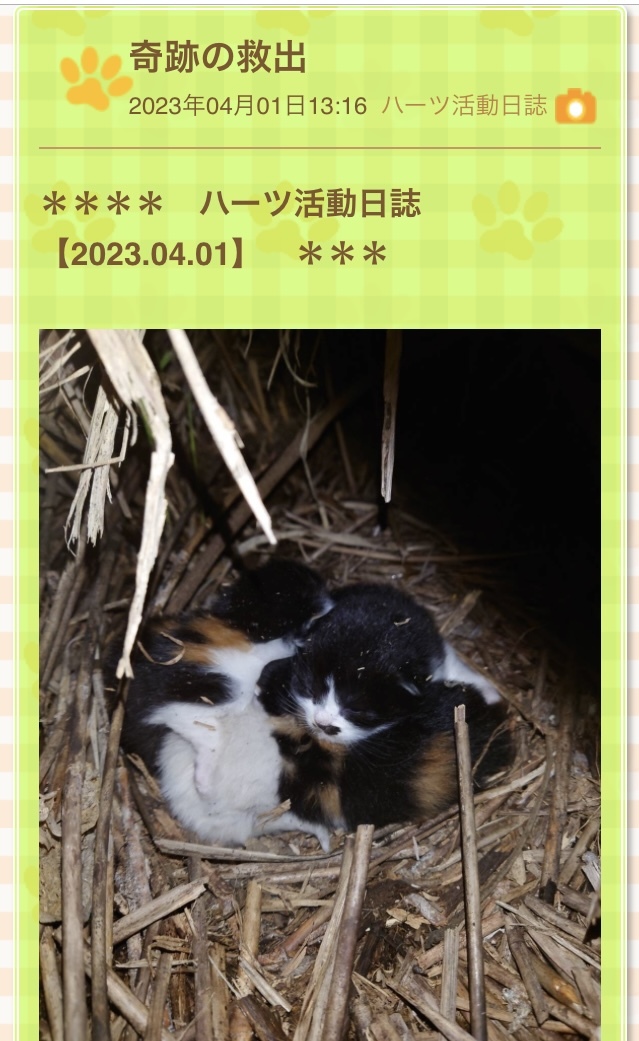 昨年4月1日のブログに書かれた、見つかったのが奇跡のような子猫達。里親様の元で幸せになり、こんなに大きく成長しました。