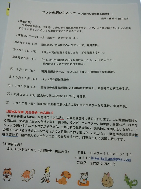 それぞれの動物たちのお世話でお忙しいとは思いますが、災害が起こりにくい地域であっても、その施設が火事にあったら・・・自分が事故にあったら・・・等、災害時と同じ緊急時は誰にでも起こりうるので、ぜひ、一緒に「その時」に備え、学んで行きたいと思っております。(様子は、ブログ:ほにほにでいこう に掲載)