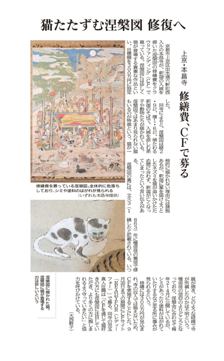 このたび、涅槃図修復のクラウドファンディングについて、京都新聞令和7年9月2日火曜日の朝刊 に掲載していただきました。
