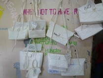 産業廃棄物を材料にして作られるバッグ作りを行っています。現在は10名ほどのお母さんたちがバッグを制作中です。今回1万円以上のご寄付を頂いた方に、こちらのバッグをお送りいたします。