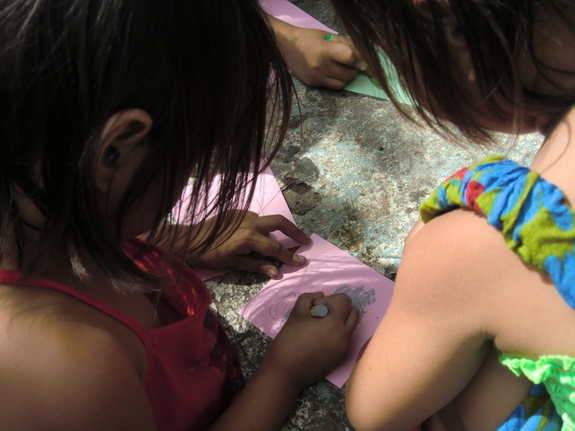 早速ゴミ箱に貼るゴミの絵を描く子供たち。ずっとLoregaに残るこの絵。十分な数の椅子や机もありませんが、子供たちはみんな一生懸命です。