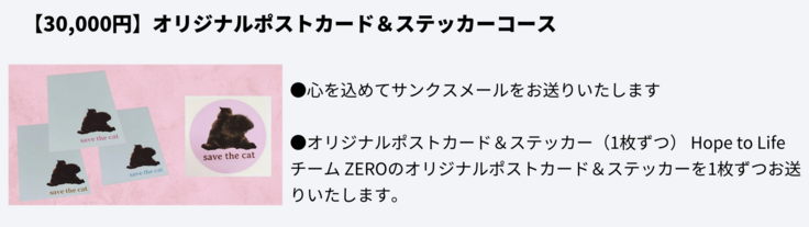 今回のプロジェクトでは、すべて対価性のないリターンとなっております。皆様のご支援をできる限り、猫さんたちのために大切に使わせていただきたいと思っています。