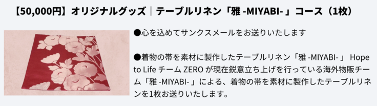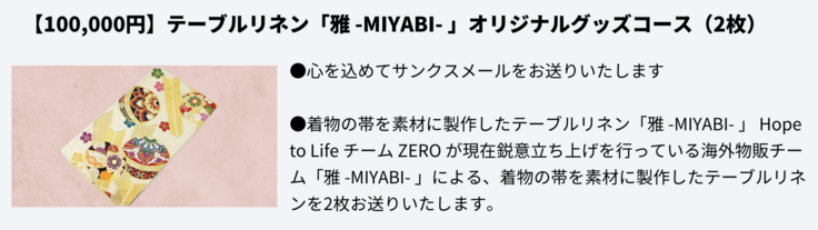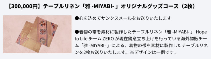 一口3,000円〜30万円までご予算に合わせて選択いただけます。こちらは、特別なリターン品をお届けしない代わりに、ご支援のほぼ全てをプロジェクトに充てさせていただくコースです。