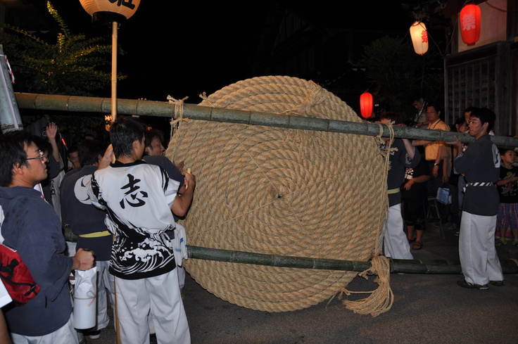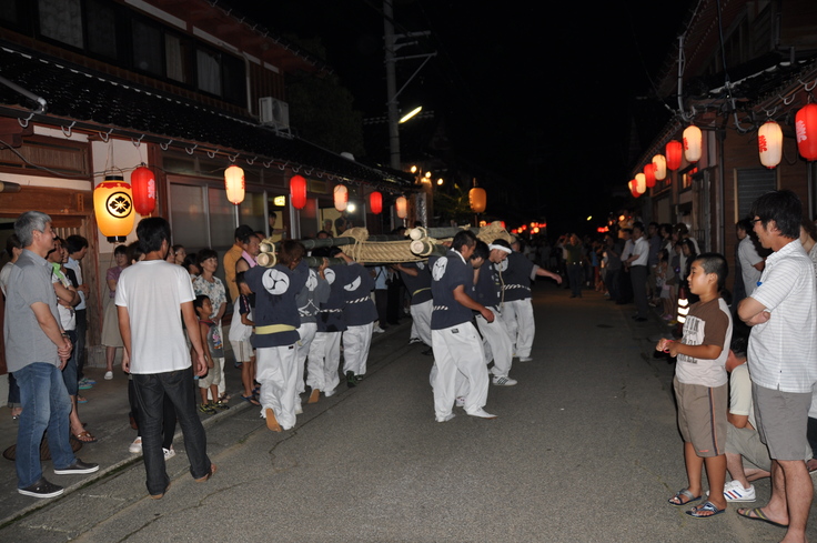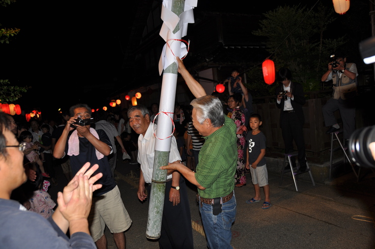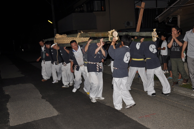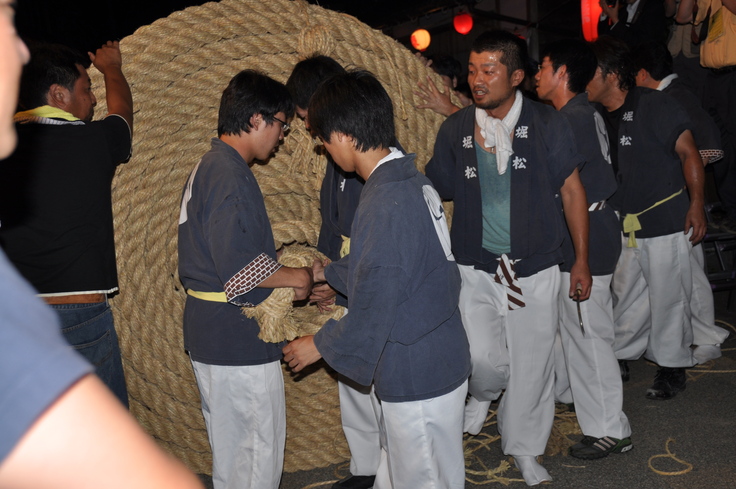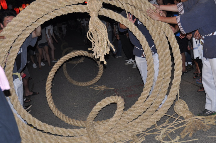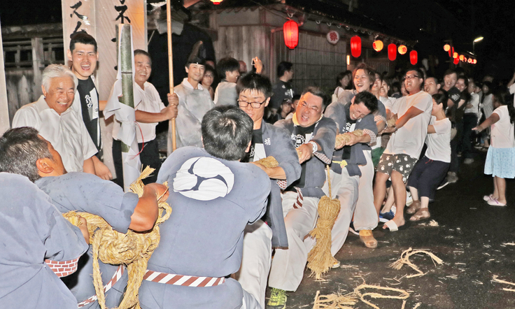 大綱を横に倒し、山側と海側に分かれて走って綱を引っ張り伸ばします。