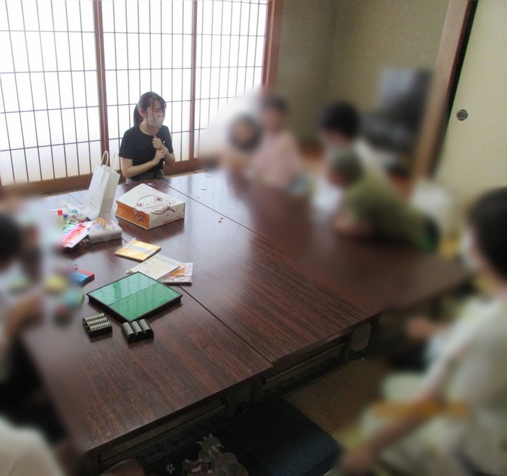 お弁当準備の後はこども達と一緒におはじきや、ジェンガなどで遊び、