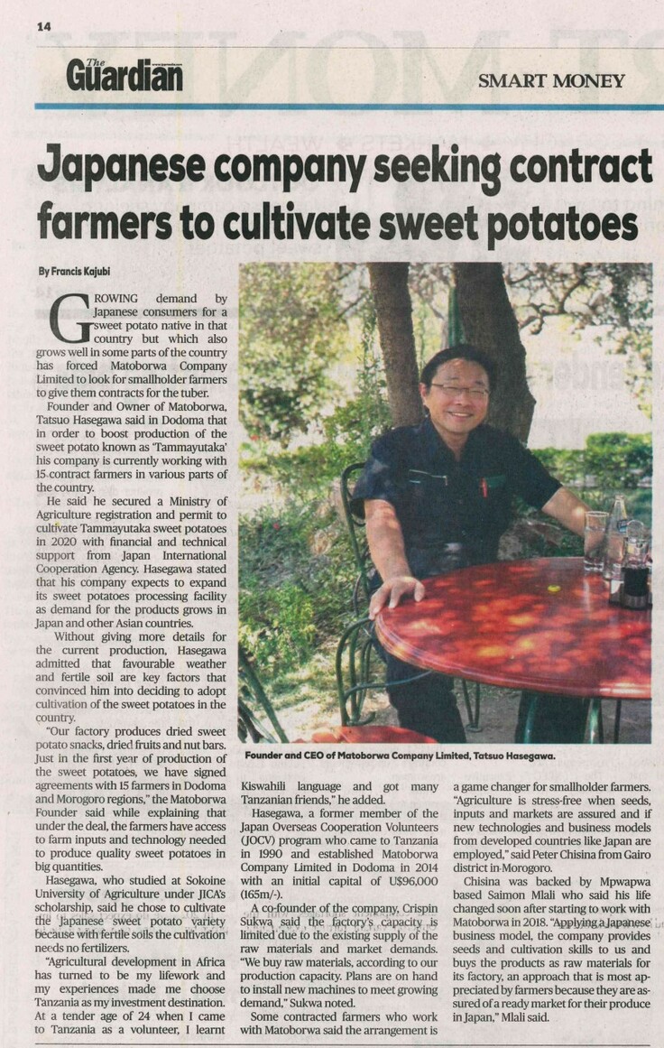 日本企業がサツマイモ契約農家を募集!という見出しで、本日(12月28日)の新聞『Guardian』に私たちの事業が掲載されました。