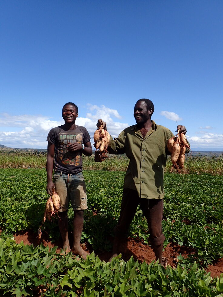 先週(6月2日)に収穫したの契約農家ジェレミアさん(右)の畑です。隣ですこし照れながら笑っているのは息子さんです。