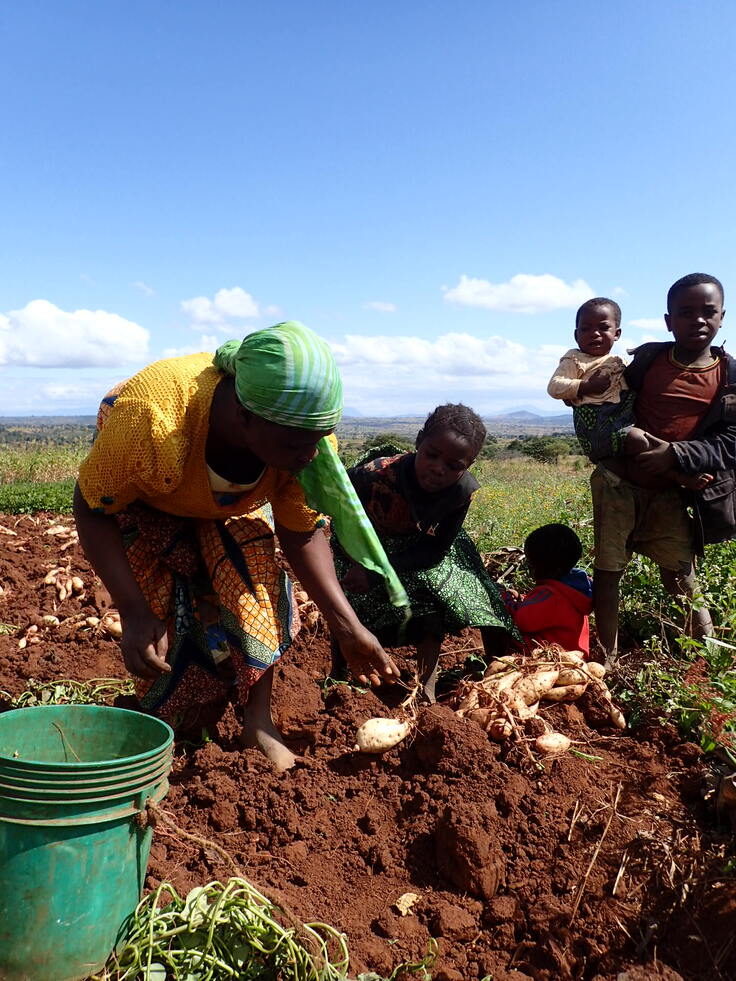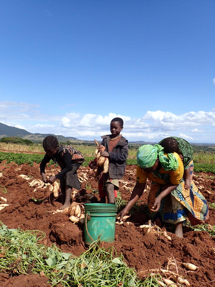 午前中にジェレミアさんが鍬で堀ったイモを、畑において表面を乾かしていると、学校の授業が終わった子供達と、そのお母さんがやってきました。家族総出の収穫作業です。