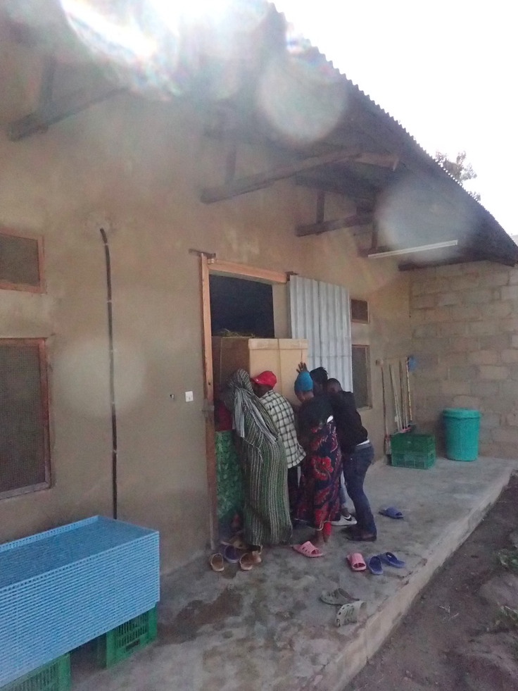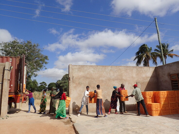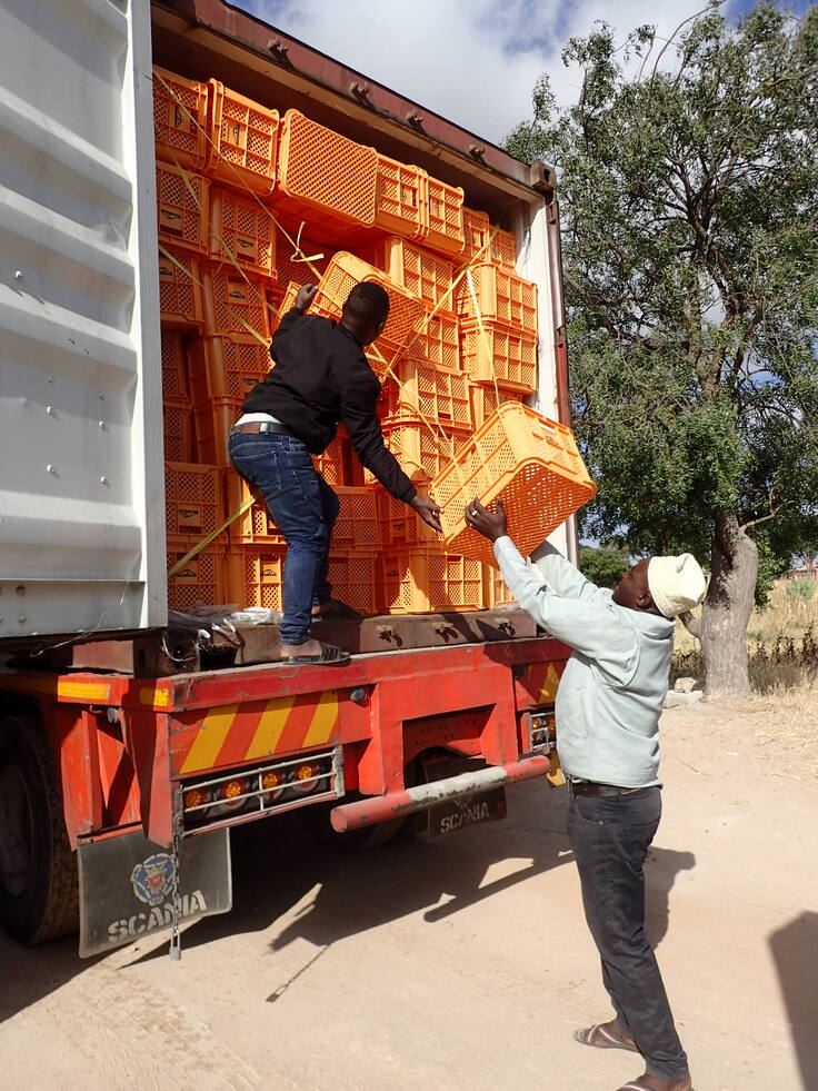 とうとう食品乾燥機と収穫コンテナが工場に届きました。日本から来た海上輸送コンテナの扉を開けると、ピカピカの新しい収穫コンテナがぎっしり!もうなんだか眩しくて嬉しくて、輝いて見えました!