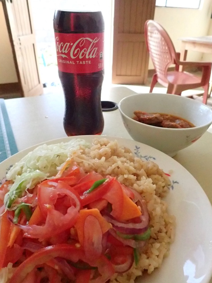 作業が終わっても、お祭りのような高揚感で全員が興奮状態。「今日はお祝いのプラウ(混ぜご飯)を炊きたいと皆が言っています!」と工場長に言われ、昼飯はプラウ+炭酸飲料の、ちょっと贅沢なランチでした。