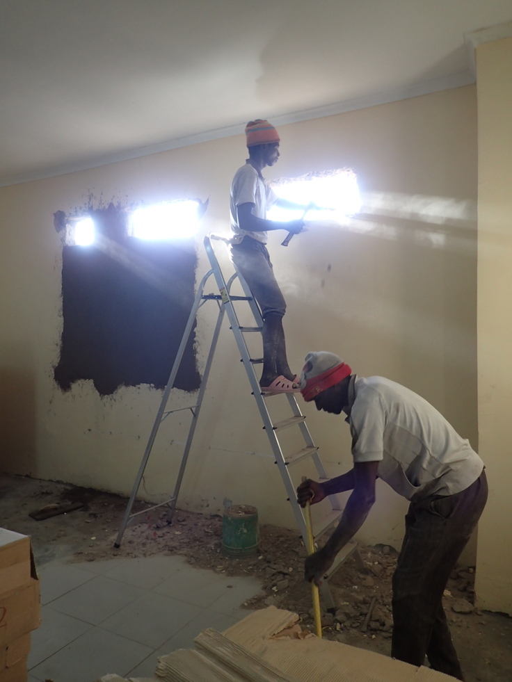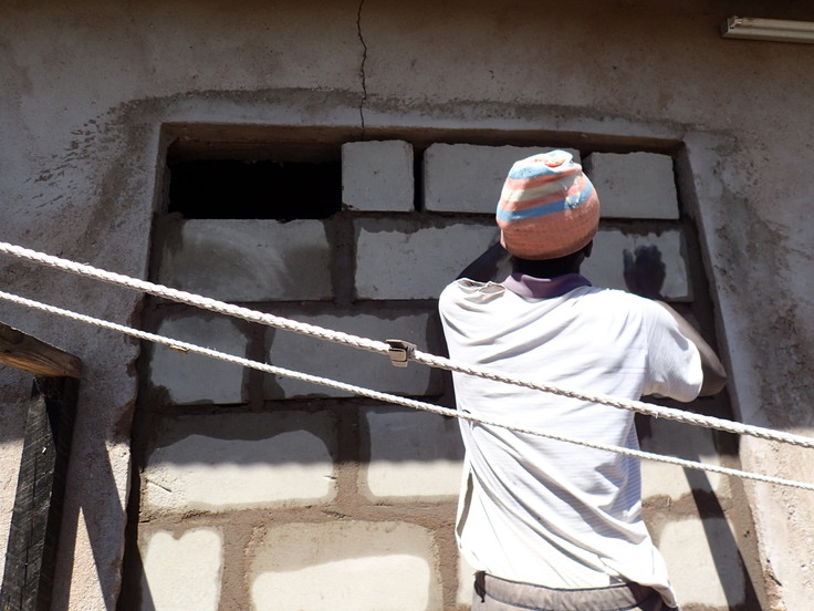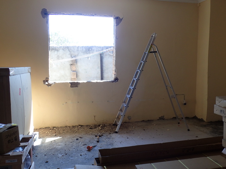 窓枠の周囲の壁を壊して取り外し、そこにブロックをはめ込んで塗ります。それから煙突用、ダクト1号用、ダクト2号用…と、穴を開けています。