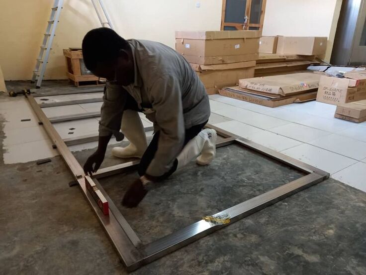 最初に乾燥機をのせる基礎を組みます。それから水平器で計りながら、基礎が完全に水平になるように調節していきます。