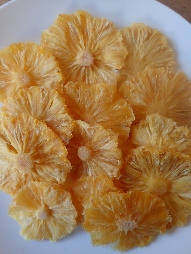 通常のドライパイナップルと比べると、どれくらい乾燥しているかわかると思います。褐色なのは焦げているのではなく、乾燥による褐変…だと思います。