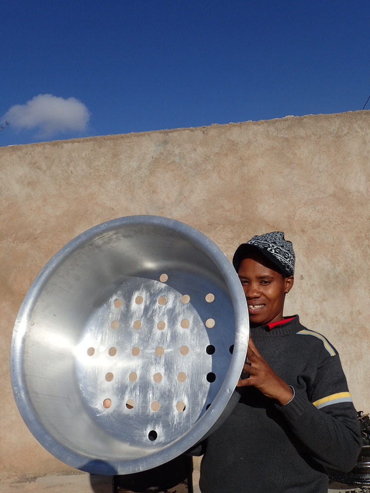 蒸し器の能力が、ぜんぜん足りなかった。もう予算もないので、市販の大きめの鍋をつぶさに見て回り、それを5つ買って穴を開けて蒸し器に改造しました。
