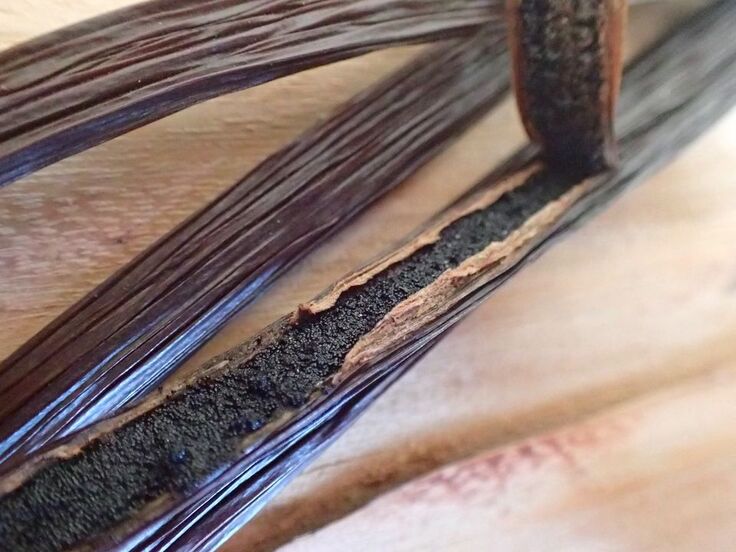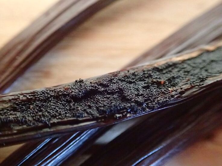 莢をむくと、中に黒くて細かいバニラビーンズがぎっしり。タンザニア産バニラはチョコレートのような、甘~い香りがします。