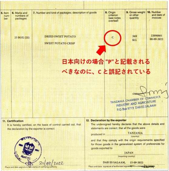 記載の不備とは、原産地証明の中段にある「8. Origin criterion」の部分。日本に輸入する場合は"P"と記載されるべきなのが、Cと誤記されていました。そう、たった1文字のミスなのです。