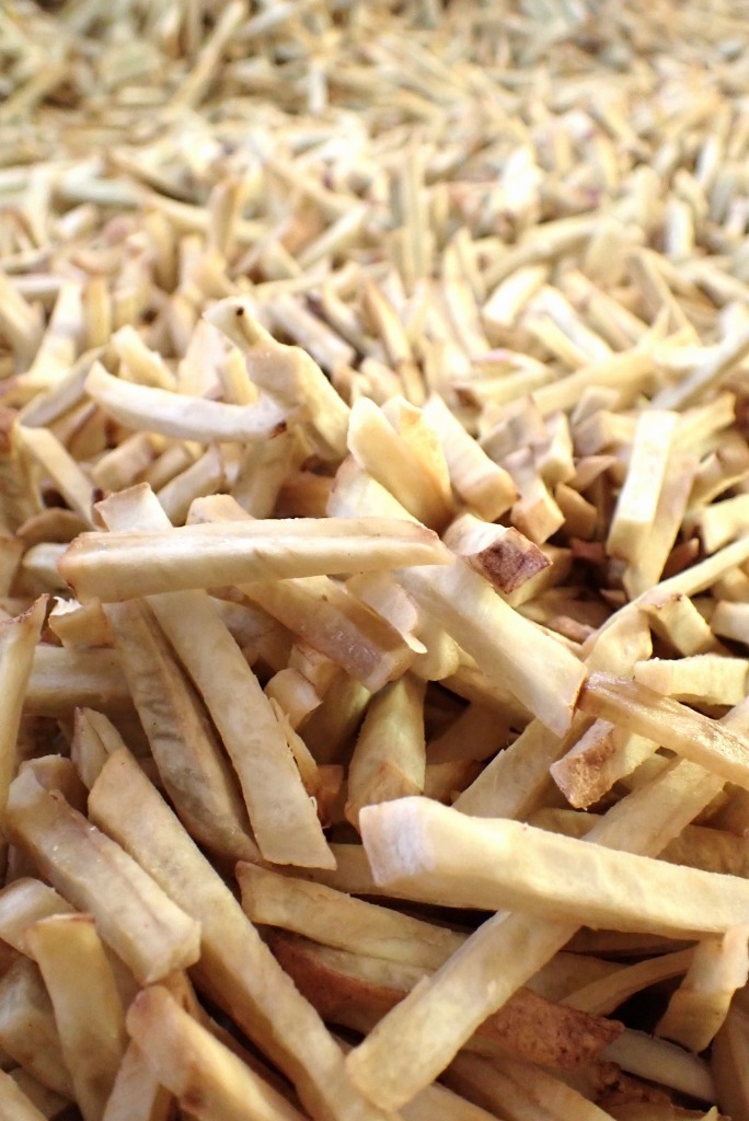 収穫したての小芋は皮も柔らかく、芋肌もキレイなので、粗く皮を剥いて角切りにして油で揚げて「生地」にします。後にこれをもう一度揚げて、さらに糖衣をかけてイモケンピに仕上げます。