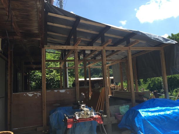 星尾温泉の工事は最終段階に入っています(写真のとおり)。浴室の骨組みが完成し、現在は、源泉から浴室への配管と外壁工事を行っています。しかしながら、猛暑により日中の作業時間が限られることや、防水や配管などで専門知識が必要な作業が多く、予想以上に時間を要しています。