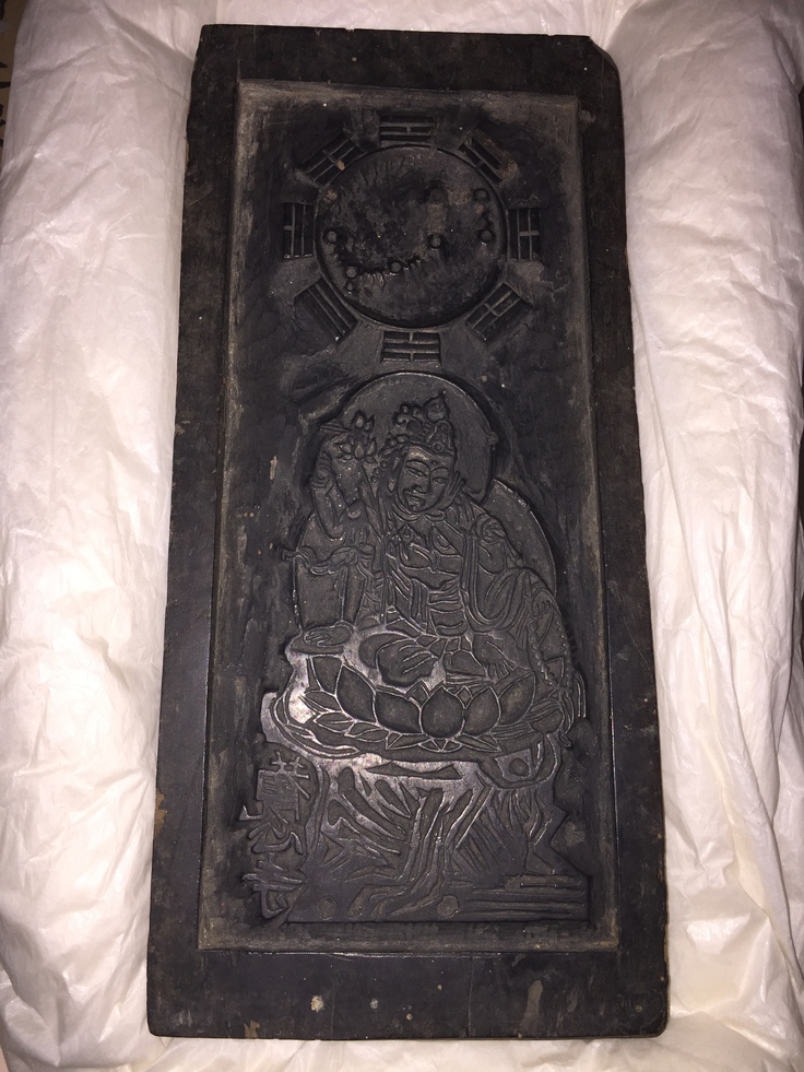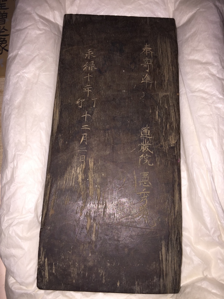 3年前に京都国立博物館で開催された「観心寺・金剛寺展」に向けて行われた観心寺の全体調査で、偶然発見された永禄十年(1567年:戦国時代)の版木です。蓮蔵院とは、今はない観心寺の子院の一つです。