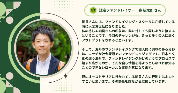 認定ファンドレイザーの森 新太郎さんから応援メッセージをいただきました!