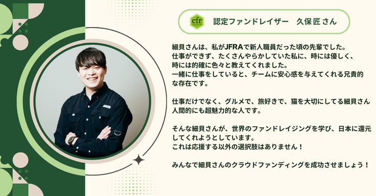 認定ファンドレイザーの久保 匠さんから応援メッセージをいただきました!