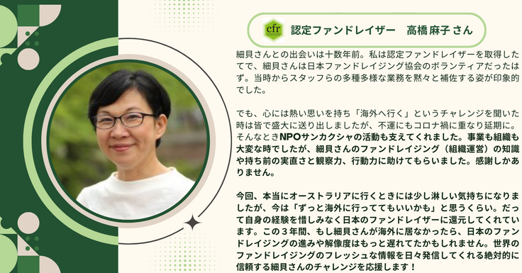 認定ファンドレイザーの高橋麻子さんから応援メッセージをいただきました!