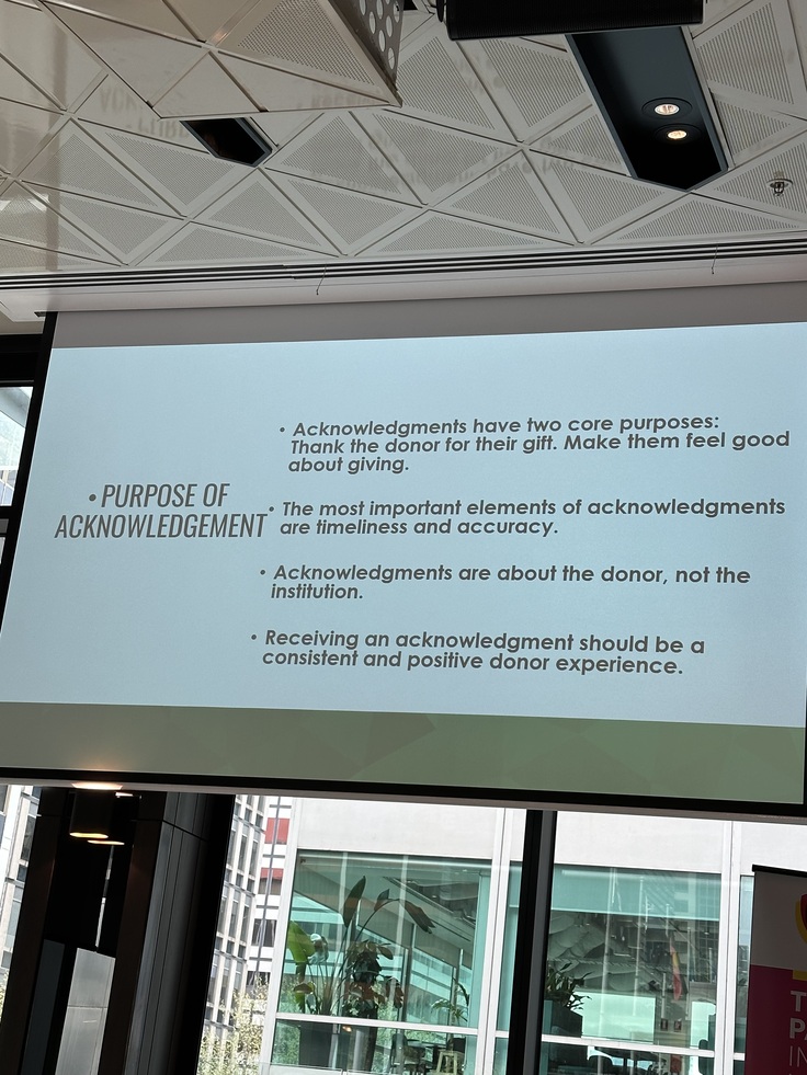 寄付者への「謝辞(Acknowledgement)」をテーマにしたセッションでは、感謝を伝える意義から見直していき、どのような伝え方ができ得るのか様々なアメリカの事例がシェアされていました。