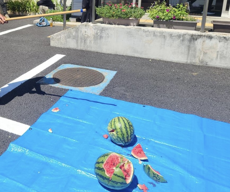 子ども心を思い出してもらいながら、約20名の参加者とともにスイカを割って、みんなで食べました。