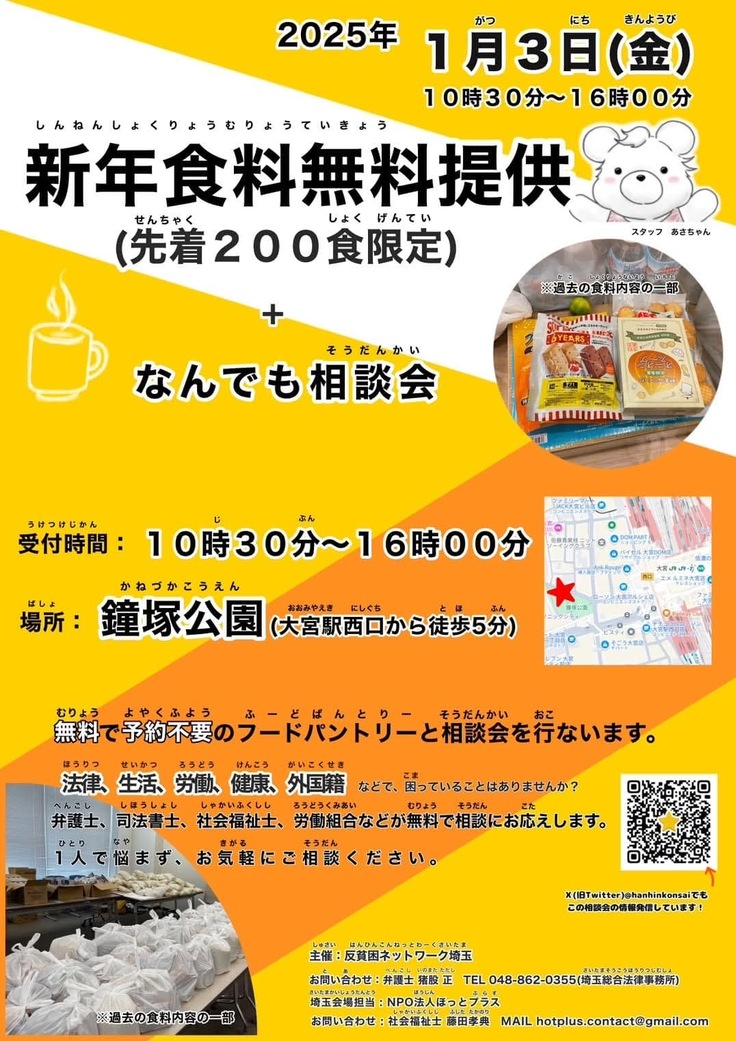 また改めて投稿する予定ですが、12/21(土)に開催した川口での相談会に360名の方が来るというこれまでにない人数だったこともあり、急遽新年明けの1/3(金)にも相談会を行うことになりました。大宮の鐘塚公園で行っていますので、必要な方に情報を届けていただけたらと思います。