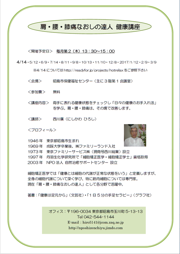 本年4月14日、昭島市保健福祉センターにおいて、私、西川廣が「肩・腰・膝痛/健康セミナー」を開催する予定です。このセミナーでは、参加者其々のセラピーポイント(手の一部に肩や腰や膝痛の原因となる物質が溜まっている場所)にシールを貼ります。