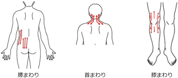 不調が起こりやすい体の部位(腰・首・膝など)には、「Hot&Relax」を直接患部に当てて使用できます。マッサージ棒の先端を皮膚の上から縦に横に軽く滑らせるだけで、マッサージや指圧と同じような効果を得られます。