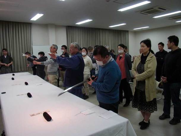 本日、備前長船刀剣博物館において午前中に日本刀初級者講座を開講し、午後からは姫路しらさぎ刀剣会より講師をお招きし日本刀鑑賞会を開催しました。今回も会場に錆びた状態の奉納刀を展示してみていただきながら、これまでの奉納刀研磨プロジェクトの経過報告をしました。この後、参加者の方から新たにたくさんのご支援を賜りました。本日までに岡山県支部で集めた支援金を合計すると68万円になり、86名の方からご協力をいただきました。クラウドファンディングの金額と合わせて200万円になれば第2目標達成です。あともう少し皆様のご支援よろしくお願い申し上げます。