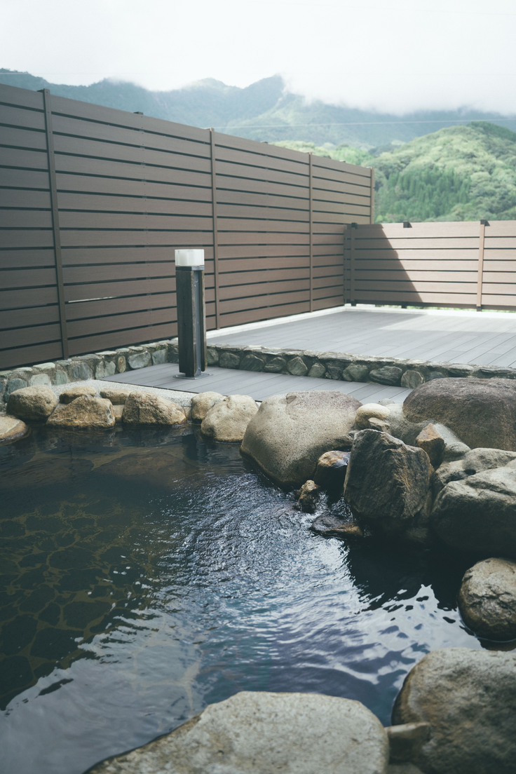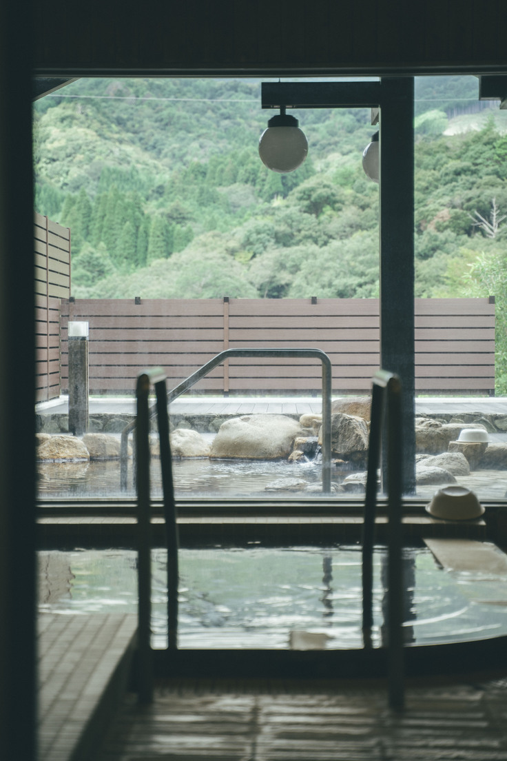 祝子川の山々を望みながら、ぬる湯でじっくりと浸かれる露天風呂。長湯をしても体にやさしいのが嬉しいポイント。森の風を感じながら、内湯と「温冷交代浴」をすれば、祝子川ならではの「ととのい」体験を楽しめます。