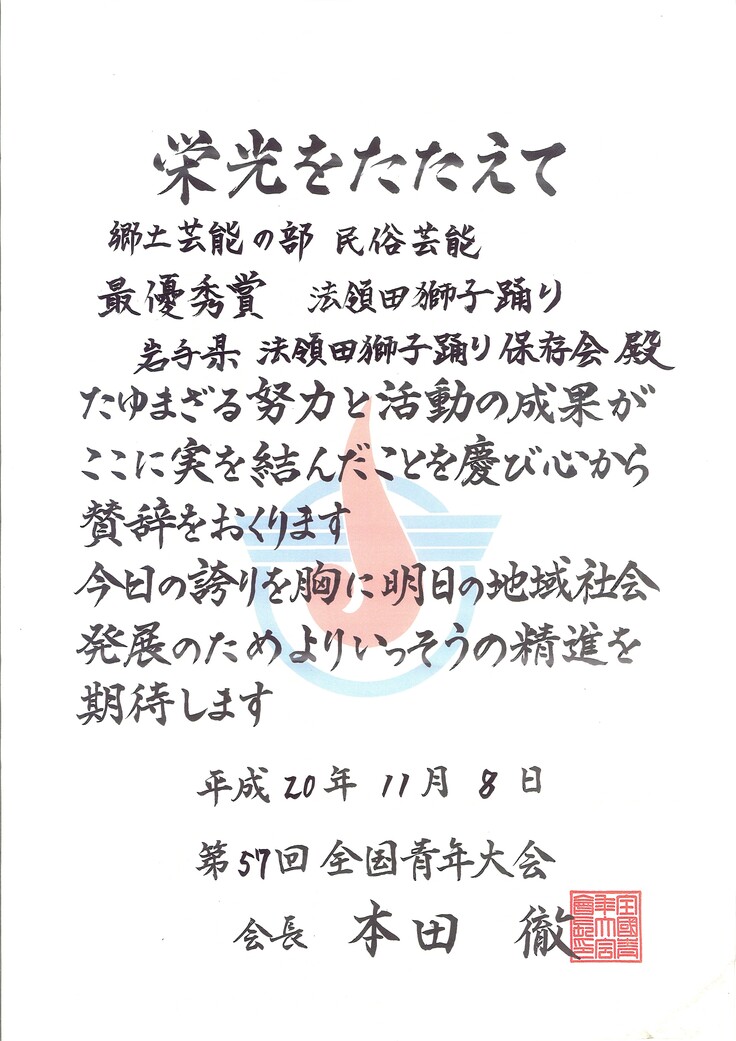 2008年(平成20年)の全国青年大会では最優秀賞を受賞!