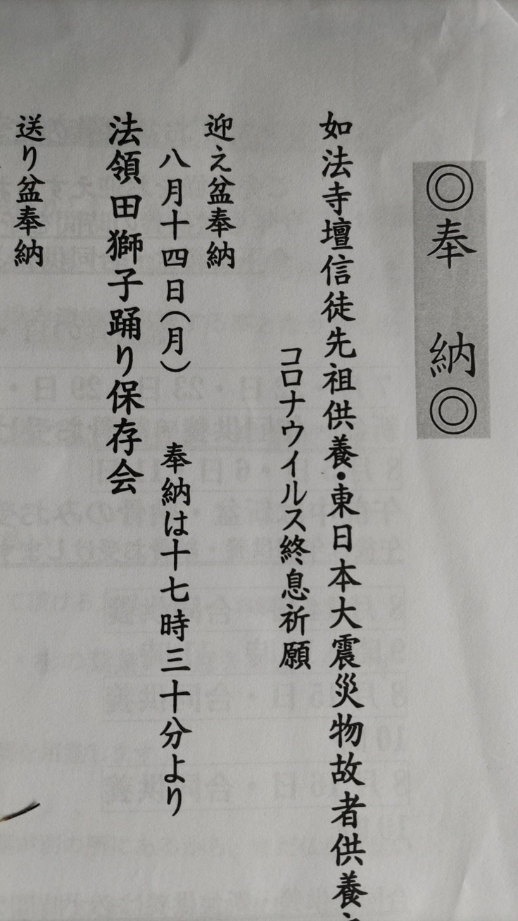 毎年、地元如法寺様で我々、獅子踊りの舞を奉納させて頂いております。しかし、近年はコロナ禍ということもあり、人を集めての披露も出来ておりませんでした。しかし、今年はかつてと同じように披露させて頂きました。