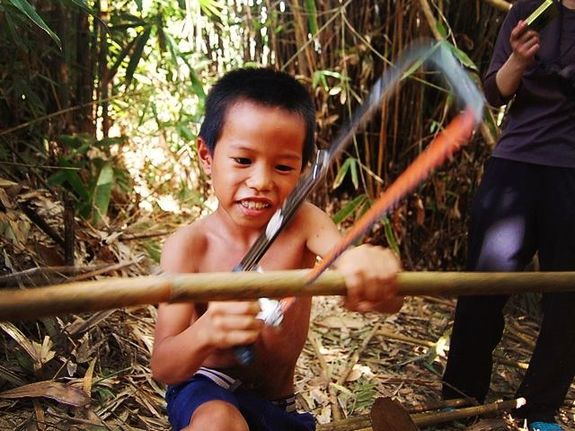 音楽隊を作るには楽器が必要です。でも、日々の生活に手一杯なHOJには、高価な楽器を買う資金はありません。日本でいらなくなった楽器をおくってもらう、というのもいいかもしれませんが、それではどうしても「自分たちの音楽」という誇りが持てない気がします。こどもたちに「寄付してもらわないと何もできない」という頼り癖がついては大変です。だから、私たちは山から竹をとってきて、それで自分たちで楽器を作ることにしました!