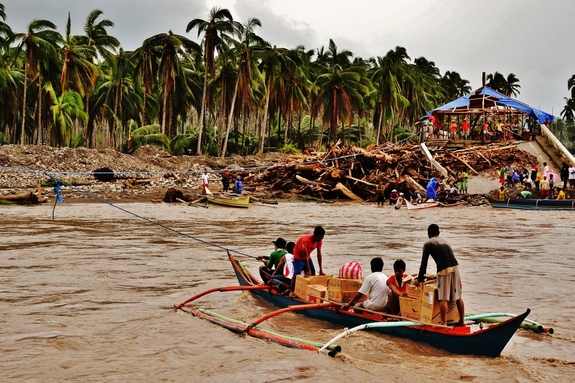 (台風で増水し橋が流され、救援物資を渡し船で運ぶ被災地)