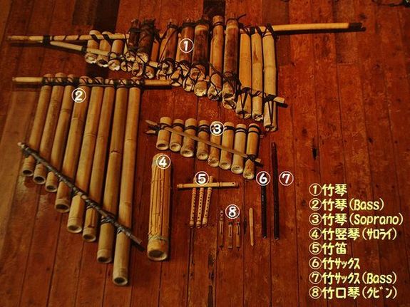 ①の竹琴は基本的に日本人が習った真ん中のドを基準にして一オクターブ上まで作っています.