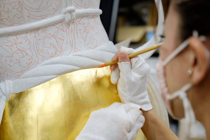 天平時代の線は、とてものびやかでいきいきとしています。下書きをただなぞるのではなく、線が互いに響き合うよう、像全体のなかでどう見せるのか考えながら、硬くならないよう、慎重かつ大胆に描いていきます。