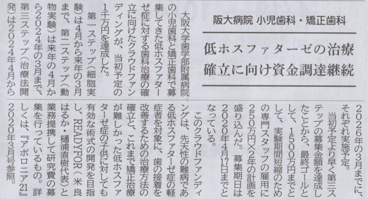 3月24日発行の日本歯科新聞8面に、本プロジェクトについて掲載していただきました。許可をいただきましたので、お示しいたします。