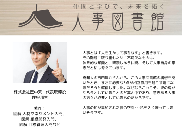 「壺中人事塾」塾長、「図解 人材マネジメント入門」などの著作でも知られる、株式会社壺中天代表取締役 坪谷 邦生さんから応援を頂いております!