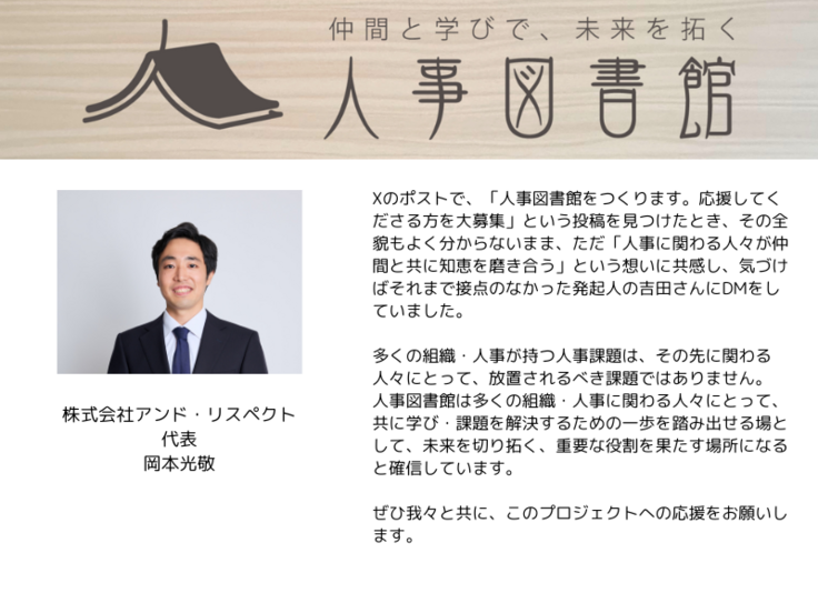 人事制度・教育・採用・人事システム導入等、幅広く人事に関わる企業支援を行う株式会社アンド・リスペクト代表の岡本光敬さんより応援を頂いております!