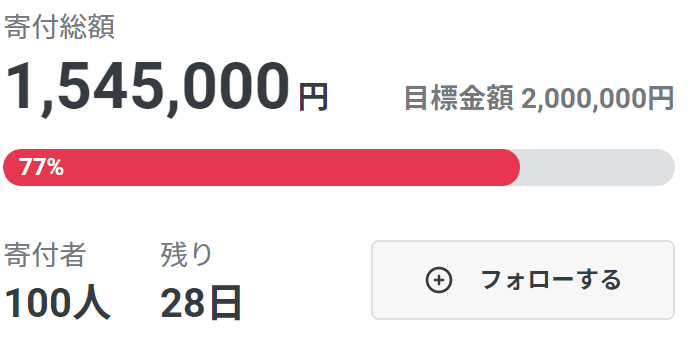 現在までに目標額の77%,1,545,000 円のご寄附を頂いており,のべ100名の方々からご支援を頂いております。