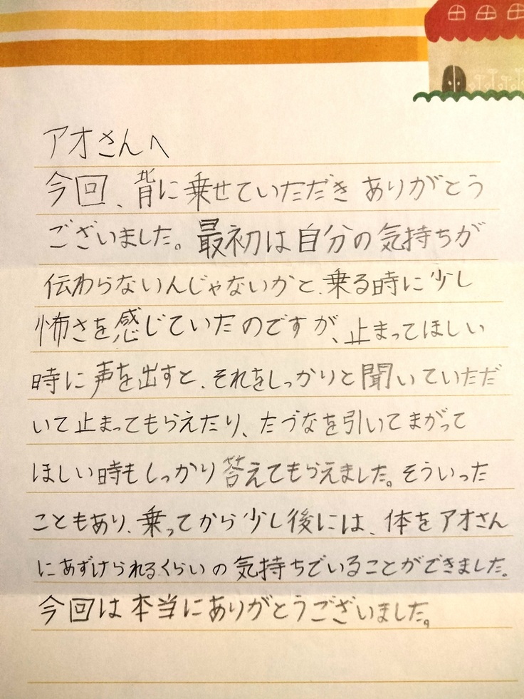 帰ってから、こんな素敵なお手紙をアオちゃんに書いてくれました。