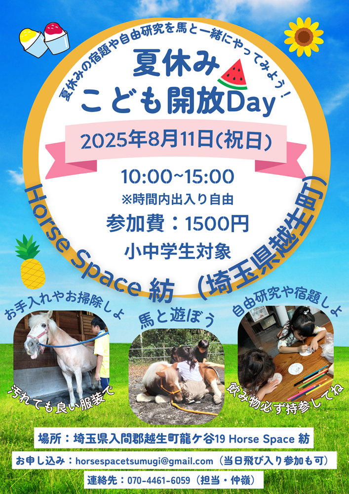 夏休みの自由研究や宿題を馬たちと一緒にやってみたい小学生~中学生のために牧場を開放いたします!!!