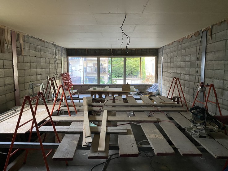 お部屋の工事も始まりました。自分で内装はすべて解体したのですが、そこに大工さんや電気屋さん、水道屋さんがせっせと空間を作り上げていってくださっています。まだまだこれからですが、2Fの宿泊スペースオープンに向けて引き続き頑張ります。