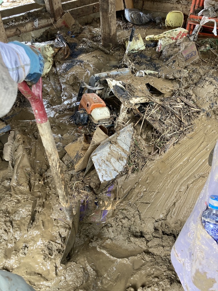 私たちメンバーの家や田畑も被害を受けました。大雨で泥水や土砂が流れ込み、床上床下浸水の被害を受けた家もあります。収穫間近の田んぼや畑などは見るも無残な姿となりました。道路はあちこちで陥没し、橋や線路は崩落しました。災害後、町民はもとより、多くの災害ボランティアの皆さんの活動によって復旧が進められました。
